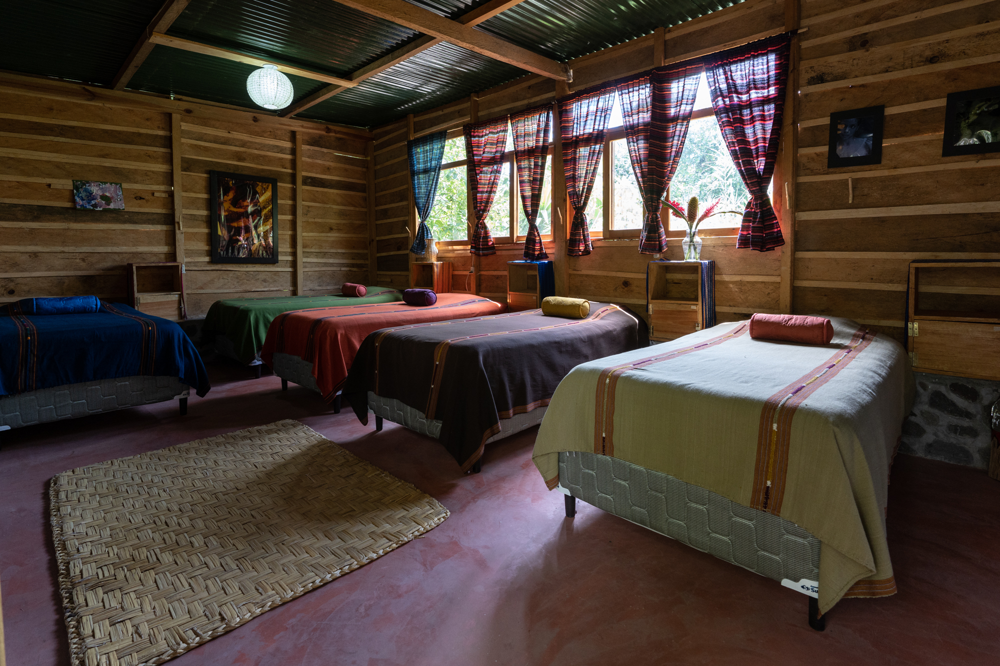 We currently have three private rooms with en-suite bathrooms in our “Casa Amor” log cabin accommodation. These rooms each have a skylight and a bathroom featuring a shower with locally sourced slate. Other elements include hand carved mirrors, bamboo and wood finishings, local hand crafted furniture and orthopedic beds. The three rooms share a deck with hammocks and chairs overlooking our beautiful garden and Lake Atitlan.